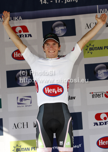 : Jan Polanc of Slovenia (Radenska) a+in white jersey as the best cyclist in U23 classification at the flower ceremony of the second stage of Tour de Slovenie 2012. The second stage from Kocevje to Metlika was 177,4 km long and it was held on Friday, 15th of June, 2012 in Slovenia.
