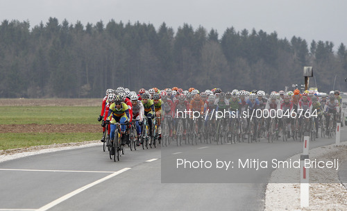 : Peloton is riding at cycling race of the 15th Grand prix Sencur 2013. Cycling race of 15th Grand prix Sencur was held on Sunday, 7th of April, 2013 in Sencur, Slovenija