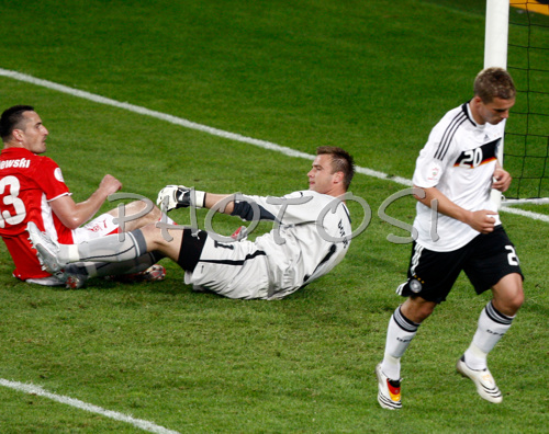 : Germanys forward Lukas Podolski reacts after scoring against Poland during the Euro 2008 Group B soccer match between Germany and Poland at the Woerthersee stadium in Klagenfurt, Austria, Sunday June 8, 2008.