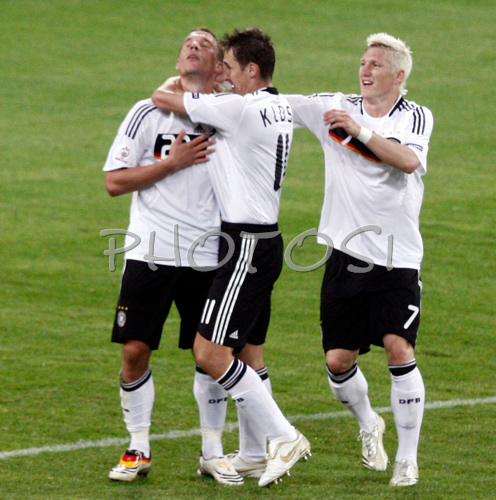 Klagenfurt ,Austria - 08.06.2008 : Germanys forward Lukas Podolski, left, celebrates with his teammates Miroslav Klose and Bastian Schweinsteiger after scoring his second gol against Poland during the Euro 2008 Group B soccer match between Germany and Poland at the Woerthersee stadium in Klagenfurt, Austria, Sunday June 8, 2008. Photo by: Mirko Guarriello / DIPAG / PhotoSI