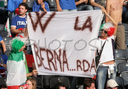 : Italian fans hold a sign prior to the kick off of the Euro 2008 Group C soccer match between Netherlands and Italy at the Stade de Suisse stadium in Berne, Switzerland, Monday June 9, 2008.