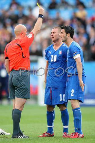 Zurich ,Switzerland - 13.06.2008 : Italys midfielder Daniele De Rossi gets a yellow card from Referee Tom Henning of Norway while Italys defender Christian Panucci, right, looks on during the Euro 2008 Group C soccer match between Italy and Romania at the Letzigrund stadium in Zurich, Switzerland, Friday June 13, 2008. Photo by: Fabrizio Forte / DIPAG / PhotoSI