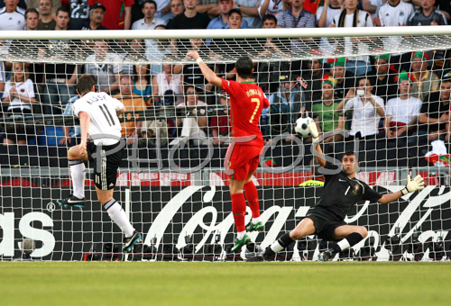 : Germanys Miroslav Klose scores during the Euro 2008 quarterfinals soccer match between Germany and Portugal on the St. Jakob-Park stadium in Basel, Switzerland, Thursday June 18, 2008.