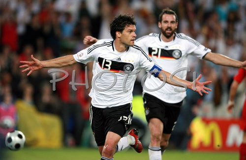 : Germanys Michael Ballack celebrating his goal during the Euro 2008 quarterfinals soccer match between Germany and Portugal on the St. Jakob-Park stadium in Basel, Switzerland, Thursday June 18, 2008.