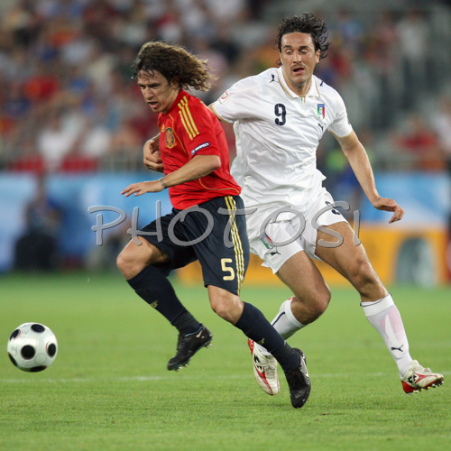 : Spains defender Carles Puyol, left, fights for the ball with Italys forward Luca Toni during the Euro 2008 quarter final soccer match between Spain and Italy at the Ernst Happel stadium in Vienna, Austria, Sunday June 22, 2008.