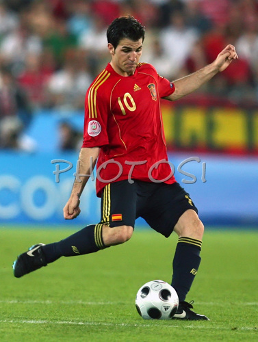 : Spains midfielder Cesc Fabregas kicks the ball during the Euro 2008 final soccer match between Spain and Germany at the Ernst Happel stadium in Vienna, Austria, Sunday June 29, 2008.