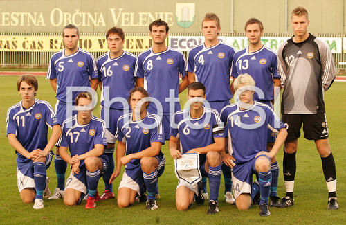 : Finnish U21 football team before football match of qualifying round of UEFA U21 Championships between Slovenia and Finland. Last match of qualifying round of UEFA U21 Championship between Slovenia and Finland was played in Velenje, Slovenia, on 9th of September 2008.