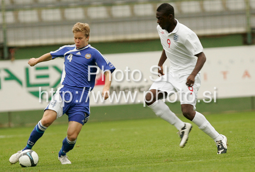 : Atte Hoivala of Finland (L) and Frank Nouble of England (R) during football match of U19 UEFA European Championships Qualification tournament between England and Finland. Match between England and Finland was played in Murska Sobota, Slovenia, on 9th of October 2009.