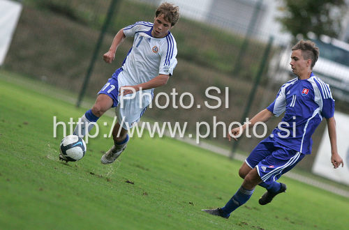 : Juuso Simpanen of Finland (L) and Jakub Povazanec of Slovakia (R) during football match of U19 UEFA European Championships Qualification tournament between Slovakia and Finland. Match between Slovakia and Finland was played in Murska Sobota, Slovenia, on 11th of October 2009.