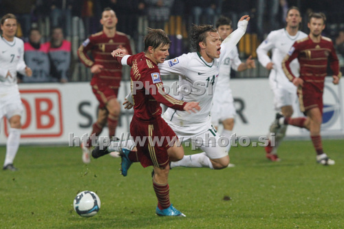 : Arshavin Andrei of Russia (L) and Dedic Zlatko of Slovenia (R) during qualification match for FIFA World Cup 2010 in South Africa. Match between Slovenia and Russia was played on 18th of November 2009 in Maribor, Slovenia. Slovenia defeated Russia with 1:0 and qualified for FIFA World Cup 2010 in South Africa.