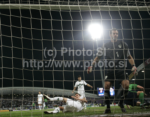 : Goalie Samir Handanovic of Slovenia after receiving goal during football match of first round of UEFA European championships qualifications between Slovenia and Northern Ireland. Match between Slovenia and Northern Ireland was played on Friday, 3rd of September 2010 in Ljudski Vrt arena in Maribor, Slovenia.