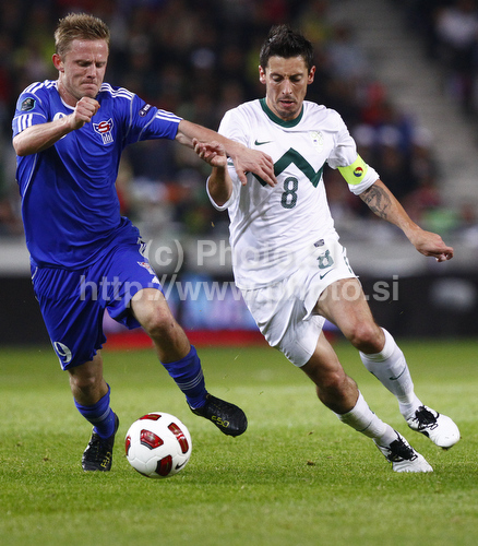 Ljubljana ,Slovenia - 08.10.2010 : Daniel Udsen of Faroe Islands (L) and Robert Koren of Slovenia (R) during football match of UEFA European championships qualifications between Slovenia and Faroe Islands. Match between Slovenia and Faroe Islands was played on Friday, 8th of October 2010 in Stozice arena in Ljubljana, Slovenia. Photo by: Primoz Jeroncic
