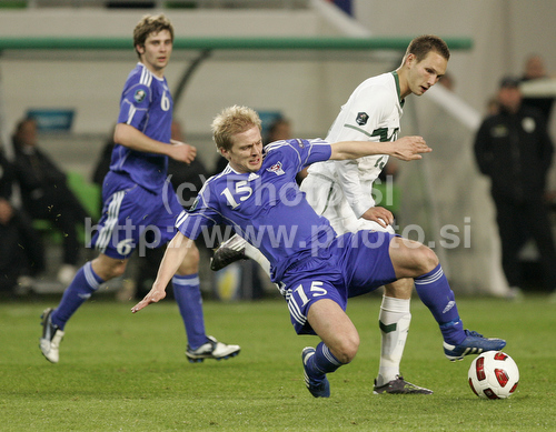 Ljubljana ,Slovenia - 08.10.2010 : Justinus Hansen of Faroe Islands and Hjalgrim Eltor of Faroe Islands during football match of UEFA European championships qualifications between Slovenia and Faroe Islands. Match between Slovenia and Faroe Islands was played on Friday, 8th of October 2010 in Stozice arena in Ljubljana, Slovenia. Photo by: Leena Jeroncic