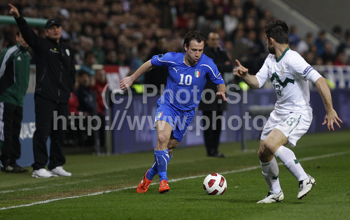: Antonio Cassano of Italy (L) and Bojan Jokic of Slovenia (R) during football match of UEFA European championships qualifications between Slovenia and Italy. Match between Slovenia and Italy was played on Friday, 25th of March 2011 in Stozice arena in Ljubljana, Slovenia.