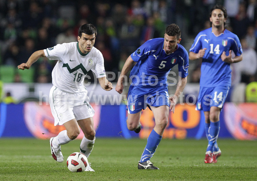 : Aleksander Radosavljevic of Slovenia (L) and Thiago Motta of Italy (R) during football match of UEFA European championships qualifications between Slovenia and Italy. Match between Slovenia and Italy was played on Friday, 25th of March 2011 in Stozice arena in Ljubljana, Slovenia.
