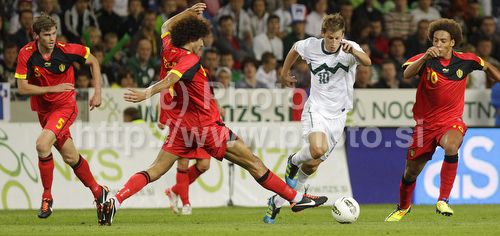 : Valter Birsa of Slovenia (M) between Marouane Fellaini (L) and Axel Witsel of Belgium (R) during friendly football match between Slovenia and Belgium. Match between Slovenia and Belgium was played on Wednesday, 10th of August 2011 in Stozice arena in Ljubljana, Slovenia.