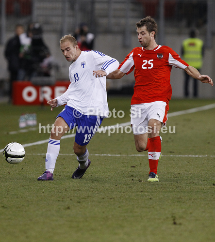 : Kari Arkivuo (no.13) of Finland (L) and Andreas Ivanschitz (no.25) of Austria (R) during friendly football match between Austria and Finland. Friendly football match between Austria and Finland, was played on Wednesday, 29th of February 2012, on Worthersee Stadium in Klagenfurt, Austria.