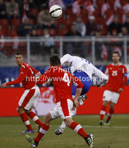 Klagenfurt ,Austria - 29.02.2012 : Njazi Kuqi (no.18) of Finland (R) and Franz Schiemer (no.4) of Austria (L) during friendly football match between Austria and Finland. Friendly football match between Austria and Finland, was played on Wednesday, 29th of February 2012, on Worthersee Stadium in Klagenfurt, Austria. Photo by: Primoz Jeroncic