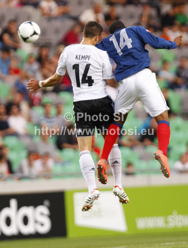 : Marc Oliver Kempf of Germany (L) and Anthony Martial of France (R) jumping for ball during football match between Germany and France of UEFA U17 European championships. UEFA U17 European championships football match between Germany and France, was played on Thursday, 10th of May 2012, in Stozice Stadium in Ljubljana, Slovenia.