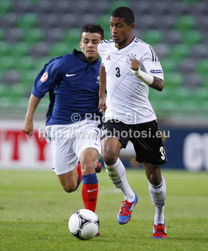 : Jeremy Dudziak of Germany (R) and Jean Corentin of France (L) during football match between Germany and France of UEFA U17 European championships. UEFA U17 European championships football match between Germany and France, was played on Thursday, 10th of May 2012, in Stozice Stadium in Ljubljana, Slovenia.
