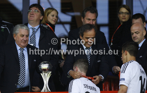 : Michel Platini presents silver medal to Marc Stendera of Germany after end of football final match of UEFA U17 European championships between Germany and Netherlands. Final match of UEFA U17 European championships football between Germany and Netherlands, was played on Wednesday, 16th of May 2012, in Stozice Stadium in Ljubljana, Slovenia.