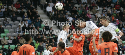: Leon Goretzka of Germany (R) scoring during football final match of UEFA U17 European championships between Germany and Netherlands. Final match of UEFA U17 European championships football between Germany and Netherlands, was played on Wednesday, 16th of May 2012, in Stozice Stadium in Ljubljana, Slovenia.