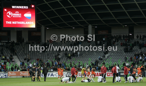 : German players rest disappointed on field after end of football final match of UEFA U17 European championships between Germany and Netherlands. Final match of UEFA U17 European championships football between Germany and Netherlands, was played on Wednesday, 16th of May 2012, in Stozice Stadium in Ljubljana, Slovenia.