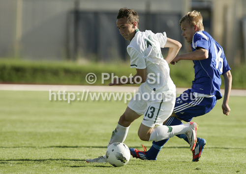 : Dejan Trajkovski of Slovenia and Joel Pohjanpalo of Finland during football match of UEFA U21 European championships 2013 qualifications between Slovenia and Finland. Qualifications match for UEFA U21 European championships 2013 between Slovenia and Finland, was played on Tuesday, 5th of June 2012, in Ptuj city Stadium in Ptuj, Slovenia.