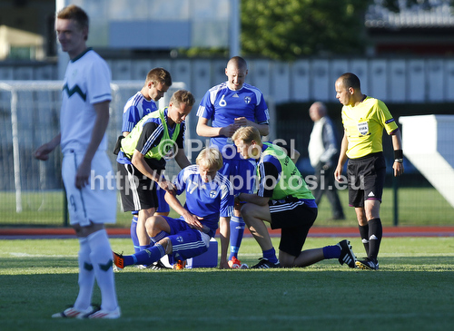 : Timi Lahti of Finland is helped after getting hit during football match of UEFA U21 European championships 2013 qualifications between Slovenia and Finland. Qualifications match for UEFA U21 European championships 2013 between Slovenia and Finland, was played on Tuesday, 5th of June 2012, in Ptuj city Stadium in Ptuj, Slovenia.