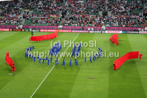 : Ceremony before start of during UEFA Football Euro 2012 match between Czech and Russia. Match of UEFA Football European Championships 2012 between Czech and Russia was played on Friday, 8th of June 2012 in Wroclaw, Poland.