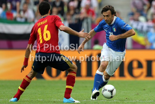 : Andrea Pirlo of Italy and Sergio Busquets of Spain during UEFA Football Euro 2012 match between Italy and Spain. Match of UEFA Football European Championships 2012 between Italy and Spain was played on Sunday, 10th of June 2012 in Gdansk, Poland.