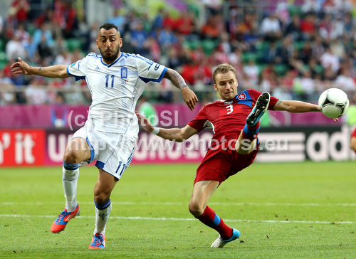 : Michal Kadlec of Czech and Kostas Mitroglou of Greece during UEFA Football Euro 2012 match between Czech and Greece. Match of UEFA Football European Championships 2012 between Czech and Greece was played on Tuesday, 12th of June 2012 in Wroclaw, Poland.