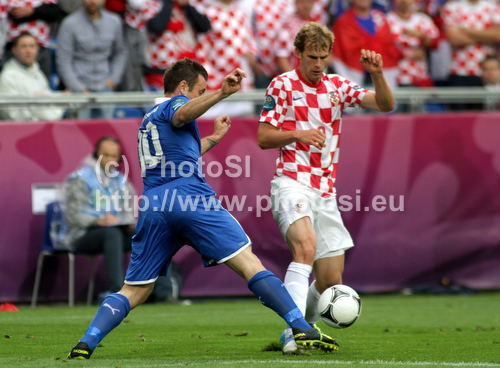 : Ivan Strinic of Croatia and Antonio Cassano of Italy during UEFA Football Euro 2012 match between Italy and Croatia. Match of UEFA Football European Championships 2012 between Italy and Croatia was played on Thursday, 14th of June 2012 in Poznan, Poland.