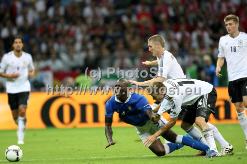 : Mario Balotelli of Italy, Holger Badstuber of Germany, Bastian Schweinsteiger of Germany during UEFA Football Euro 2012 semi final match between Italy and Germany. Match of UEFA Football European Championships 2012 between Italy and Germany was played on Thursday, 28th of June 2012 in Warsaw, Poland.