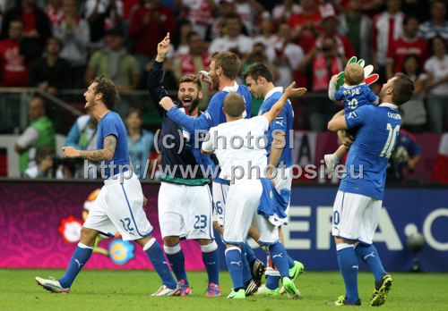 : Alessandro Diamanti of Italy, Antonio Nocerino of Italy, Antonio Cassano of Italy celebrating after winning during UEFA Football Euro 2012 semi final match between Italy and Germany. Match of UEFA Football European Championships 2012 between Italy and Germany was played on Thursday, 28th of June 2012 in Warsaw, Poland.