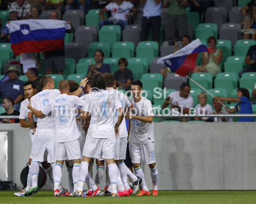 Ljubljana ,Slovenia - 15.08.2012 : Players of Slovenia celebrating goal of Bostjan Cesar in front of home crowd during friendly football match between Slovenia and Romania. Match between Slovenia and Romania was played in Stozice arena in Ljubljana, Slovenia, on Wednesday, 15th of August 2012. Photo by: Primoz Jeroncic