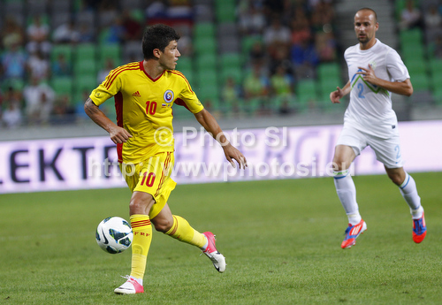 : Cristian Tanase (no.10) of Romania (L) and Miso Brecko (no.2) of Slovenia (R) during friendly football match between Slovenia and Romania. Match between Slovenia and Romania was played in Stozice arena in Ljubljana, Slovenia, on Wednesday, 15th of August 2012.