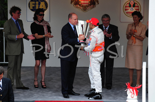 Monte Carlo ,Monaco - 25.05.2008 : Prince Albert of Monaco and Lewis Hamilton (GBR), McLaren Mercedes with trophy during Formula 1 Grand Prix of Monte Carlo. Formula 1 Grand Prix of Monte Carlo was held on Saturday, 25th of May 2008 in Monte Carlo, Monaco.