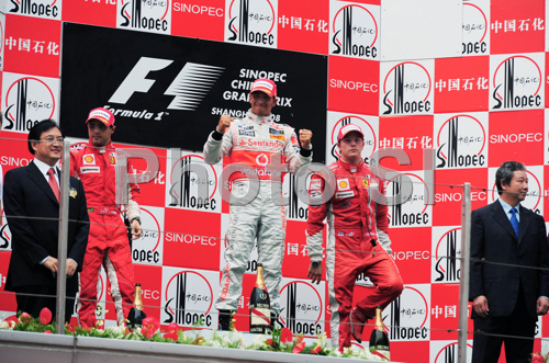 : Felipe Massa (BRA), Scuderia Ferrari, Lewis Hamilton (GBR), McLaren Mercedes and Kimi Raikkonen (FIN), Scuderia Ferrari celebrate on podium after Formula 1 Grand Prix of China in Shanghai. Formula 1 Grand Prix of China was held on Sunday, 19th of September 2008 in Shanghai, China.