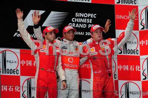 : Felipe Massa (BRA), Scuderia Ferrari, Lewis Hamilton (GBR), McLaren Mercedes and Kimi Raikkonen (FIN), Scuderia Ferrari celebrate on podium after Formula 1 Grand Prix of China in Shanghai. Formula 1 Grand Prix of China was held on Sunday, 19th of September 2008 in Shanghai, China.