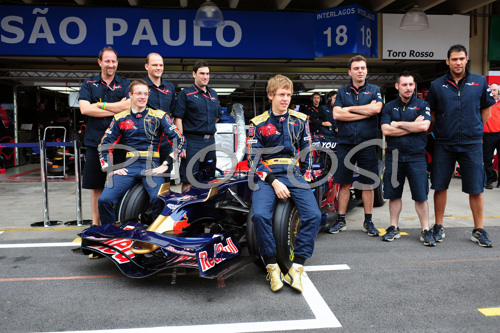 Interlagos ,Brazil - 31.10.2008 : Sebastien Bourdais (FRA), Scuderia Toro Rosso and Sebastian Vettel (GER), Scuderia Toro Rosso before free practice session for Formula 1 Grand Prix of Brazil in Interlagos, Brazil. Free practice for last race of Formula 1 Grand Prix 2008, Grand Prix of Brazil was held on Friday, 31th of October 2008 in Interlagos, Brazil.
