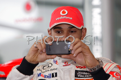 Woking ,Great Britain - 17.01.2009: Lewis Hamilton (GBR), McLaren Mercedes takes a picture with a mobile phone during presentation of new Mclaren Mercedes Formula 1 race car. Presentation of Mclaren Mercedes Formula 1 team was held in Woking, Great Britain, on 17th of January 2009. Photo by: Jad Sherif / DIPAG / Photo SI