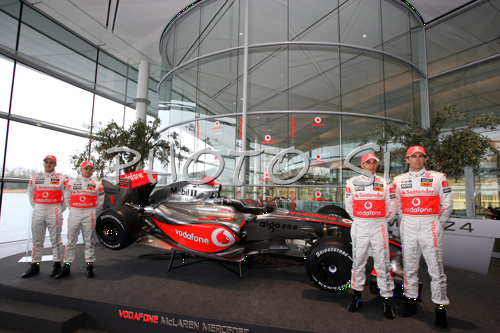 Woking ,Great Britain - 17.01.2009: Gary Paffett (GBR), Test Driver, Heikki Kovalainen (FIN), Lewis Hamilton (GBR) and Pedro de la Rosa (ESP) with their McLaren Mercedes MP4-24 during presentation of new Mclaren Mercedes Formula 1 race car. Presentation of Mclaren Mercedes Formula 1 team was held in Woking, Great Britain, on 17th of January 2009. Photo by: Jad Sherif / DIPAG / Photo SI