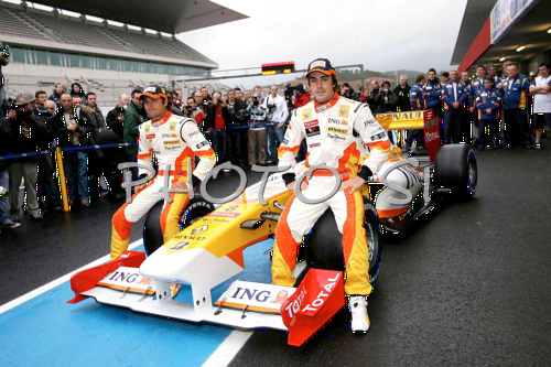 : Fernando Alonso and Nelson Piquet Jr sitting on Renault R29 during presentation of new Renault R29 Formula 1 race car. Presentation of Renault Formula 1 team was held in Portimao, Portugal, on 19th of January 2009.