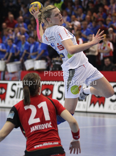 : Susann Muller (no.22) of HC Leipzig scoring during match of EHF Women Handball Champions League between RK Krim Mercator and HC Leipzig. Match of EHF Women Champions League between RK Krim Mercator, Ljubljana, Slovenia and HC Leipzig, Germany, was played in Kodeljevo Arena, Ljubljana, Slovenia, on Saturday, 13th of February 2010. Match was won by RK Krim Mercator, who defeated HC Leipzig with 32-26.