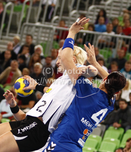 Ljubljana ,Slovenia - 07.10.2011 : Rikke Skov (no.2) of Viborg HK (L) and Ibolya Weiszne Mehlmann (no.4) of RK Krim Mercator (R) during match of EHF Women Handball Champions League between RK Krim Mercator and Viborg HK. Match of EHF Women Champions League between RK Krim Mercator, Ljubljana, Slovenia and Viborg HK, Denmark, was played in Stozice Arena, Ljubljana, Slovenia, on Friday, 7th of October 2011. Photo by: Primoz Jeroncic
