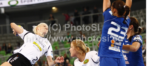 Ljubljana ,Slovenia - 07.10.2011 : Rikke Skov (no.2) of Viborg HK (L) shooting over Andrea Penezic (no.23) of RK Krim Mercator (M) and Kristina Bille (no.19) of RK Krim Mercator (R) during match of EHF Women Handball Champions League between RK Krim Mercator and Viborg HK. Match of EHF Women Champions League between RK Krim Mercator, Ljubljana, Slovenia and Viborg HK, Denmark, was played in Stozice Arena, Ljubljana, Slovenia, on Friday, 7th of October 2011. Photo by: Primoz Jeroncic