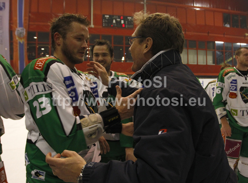 : Coach of HDD Tilia Olimpija, Hannu Jarvenpaa celebrating Slovenia national championships title with his players after ice hockey match of Slovenian league finals 2011-2012 between HK Acroni Jesenice and HDD Tilia Olimpija. Match between HK Acroni Jesenice and HDD Tilia Olimpija was held on Monday, 2nd of April 2012 in Jesenice, Slovenia.