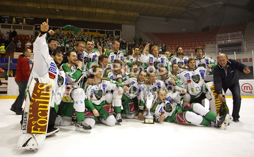 : Players of HDD Tilia Olimpija celebrating Slovenia national championships title after ice hockey match of Slovenian league finals 2011-2012 between HK Acroni Jesenice and HDD Tilia Olimpija. Match between HK Acroni Jesenice and HDD Tilia Olimpija was held on Monday, 2nd of April 2012 in Jesenice, Slovenia.