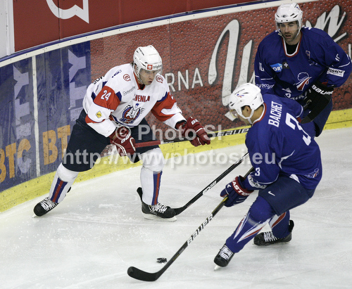 : Rok Ticar (24) of Slovenia and Vincent Bachet (3) of France during the match of EICH Ice hockey tournament between Slovenia and France. Match between Slovenia and France was held in Tivoli Arena in Ljubljana, Slovenia, on Friday, 9th of November 2012. during match of EIHC ice hockey tournament between Slovenia and France. Match between Slovenia and France was played in Tivoli Arena in Ljubljana, Sloveni, on Friday, 9th of November 2012. Match was won by Slovenia, who defeated France with 3-1.